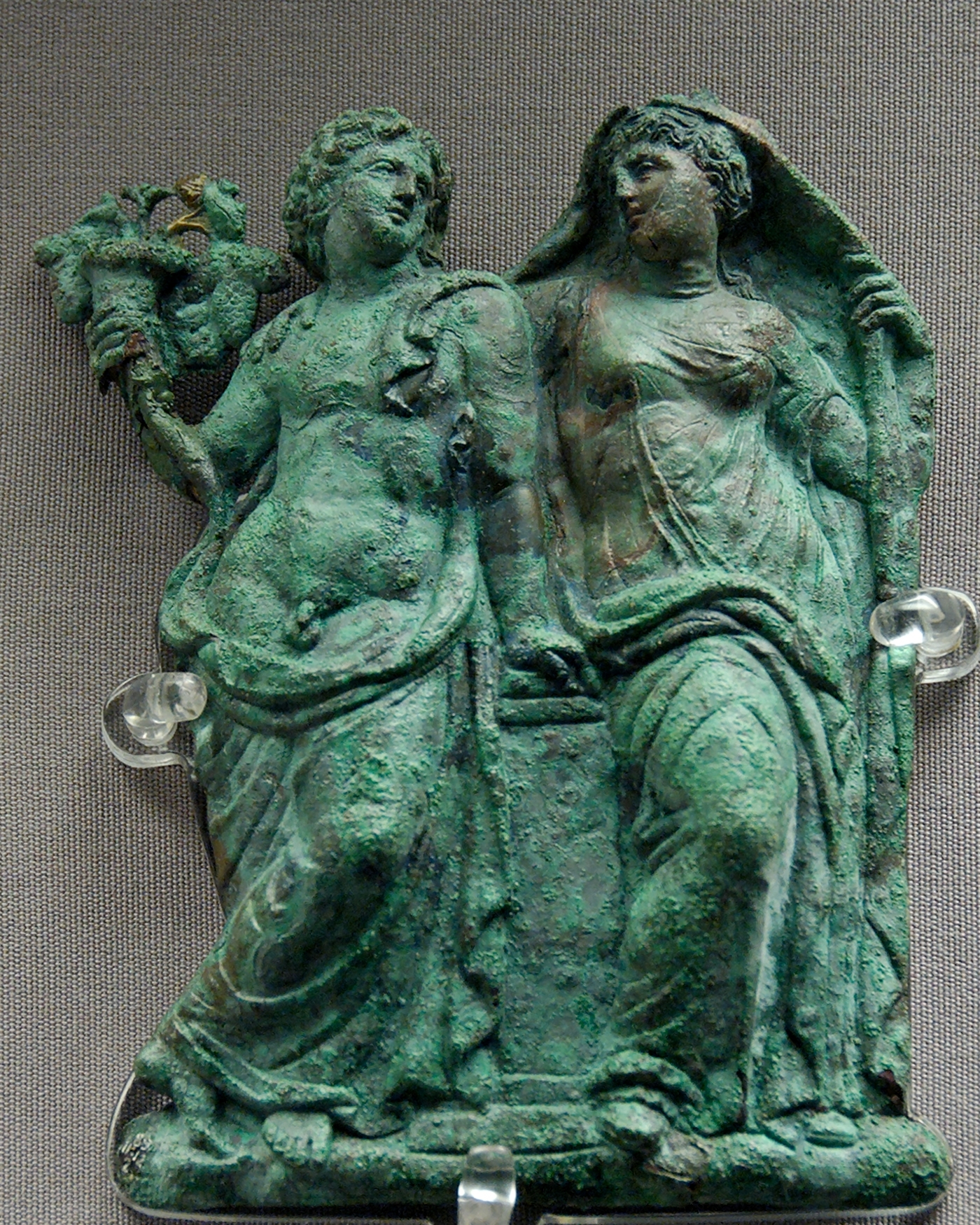 Dionysos & Ariadne (Dionysos (left) wearing a wreath and a cornucopia with Ariadne (right) holding back her veil. Bronze repoussé relief from a hydria, ca. 325–300 BC. From Chalke, near Rhodes. (Photo Credit Wikipedia Commons)